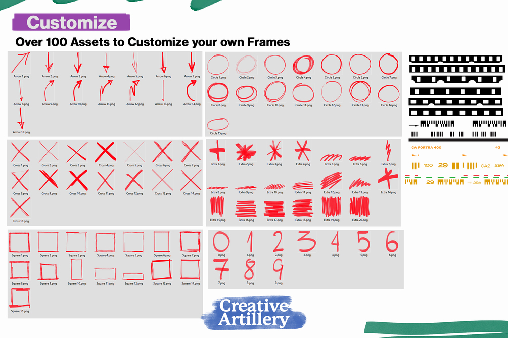 165 Pre-Made & Ready to Use Film Frames in different ratios (1x1 - 16x9 - 9x16 - Extras) and 102 PNGS Assets to fully customize your images. (6 Basic Frames - 6 Markings and 90 Brush Strokes) + 15 Templates of each ratio.
