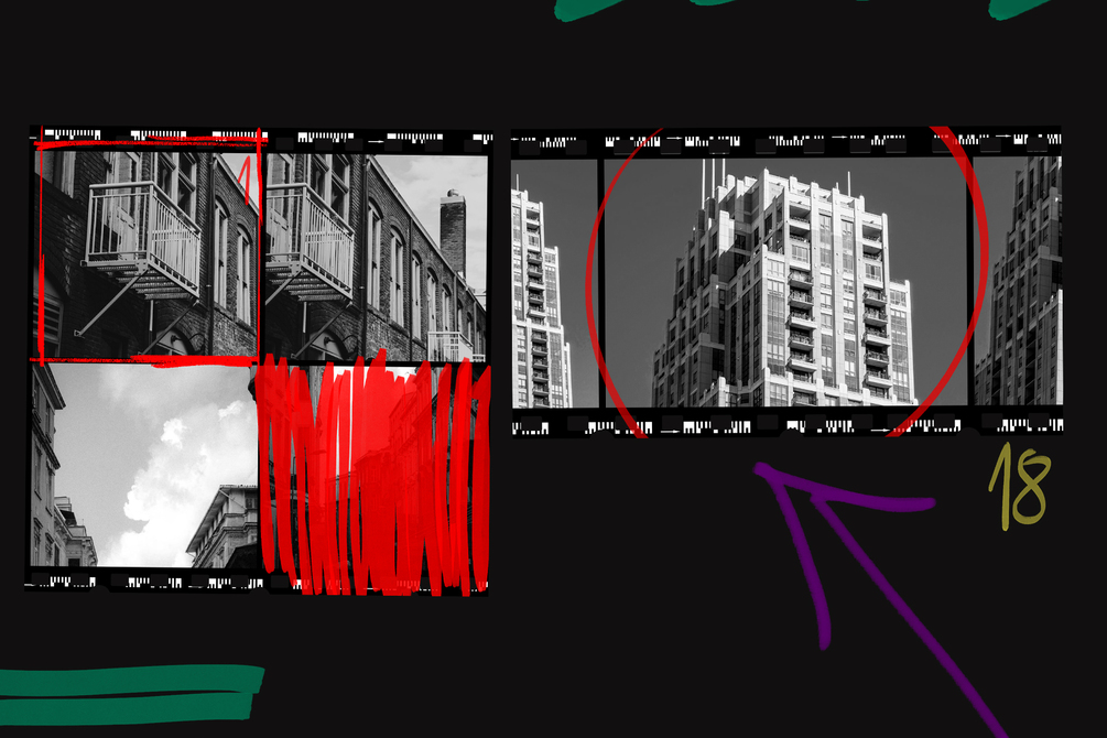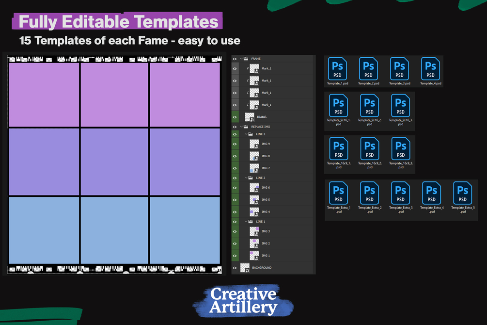 Drag and Drop the film frame pngs and create cool compositions with the brush strokes or open one of the 15 .psd, edit the template, add your photos and export!